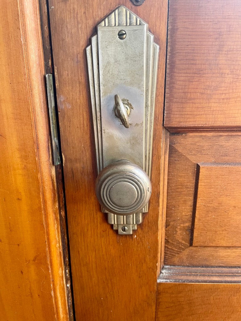 This door is one of two back doors. We have no idea why they installed two back doors–one going into a mudroom that connected to a powder room and small bedroom, all of which was closed off by another door to the kitchen. Those rooms could have been built as a “maid’s chamber” which would have been common at the time. Potentially, the second back door was used by the homeowners. However, census records show that no one lived here while the Welches did other than Glenn and Agda. In our renovation, this door is going away, along with the dead-space hallway connecting to it) to expand the kitchen. We want to respect the history, not be a slave to it!