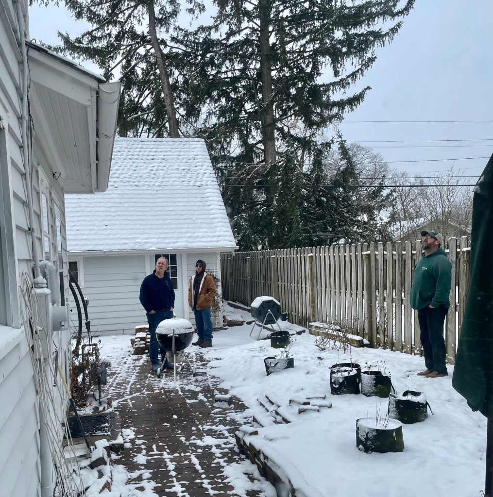 The back of the house (on the left in the photo) will be removed for the extension. Because the power is there, now, the first step is moving the box, meter, et al. It looks like demo will start in a week or so, depending on how long it takes the power company to do the work. In this photo, I’m looking out our (pretty much useless) second back door. This door will be gone and behind it will be the new extension. Time to start packing up!
