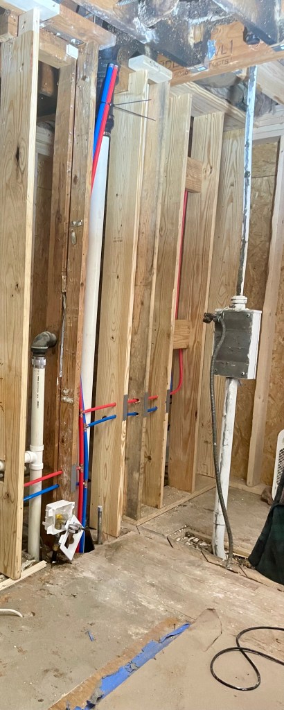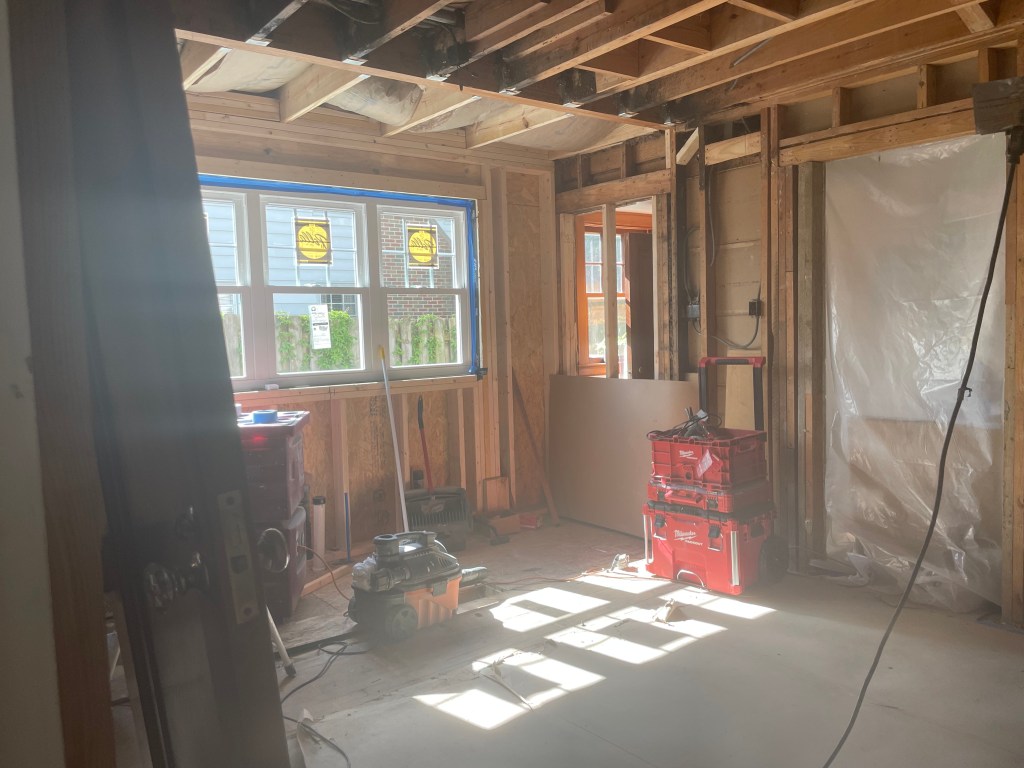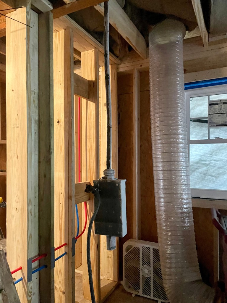 Just an hour later, the subcontracting electric company had connected, or had “got[ten] out the old one” (mostly, see below), connected the new power source to the breaker box, cleaned up, and restored the power. In total, we were out of power for 90 minutes this morning. We were astonished at how little time it took. I asked the contractor how they could do this so quickly, and the leader said that our general contractor told them that because Dan and I both work from home, the power interruption needed to be completed as quickly as possible. We were appreciative that our general contractor–who didn’t tell us that they had asked for expedited service–was taking care not only of our construction project, but our personal and professional lives.