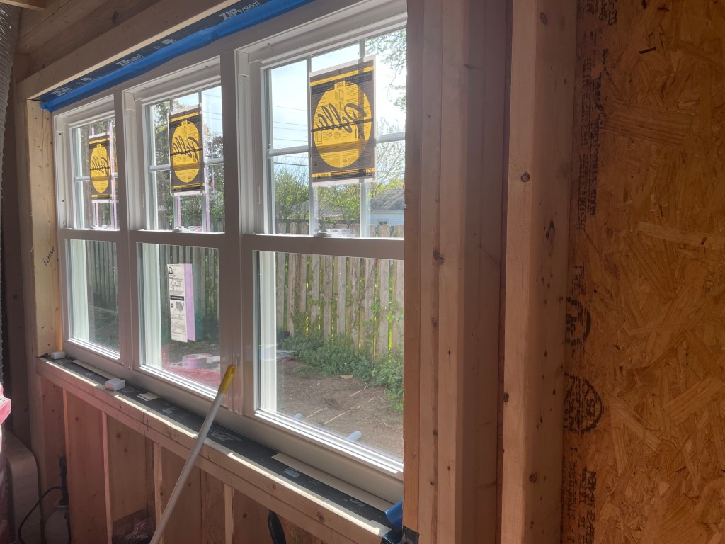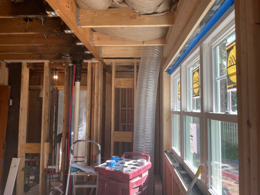 To extricate the old cable infrastructure, and seal the opening “J”– I’m not naming him for his privacy, although we adore him and his work–took off the tarp from the addition’s roof and thus the windows. It was hot, difficult work, so he opened the new kitchen windows. And because we have, finally, good weather in Indiana, he left the tarp off so at the end of the day, we can see how much light the new windows will give us!