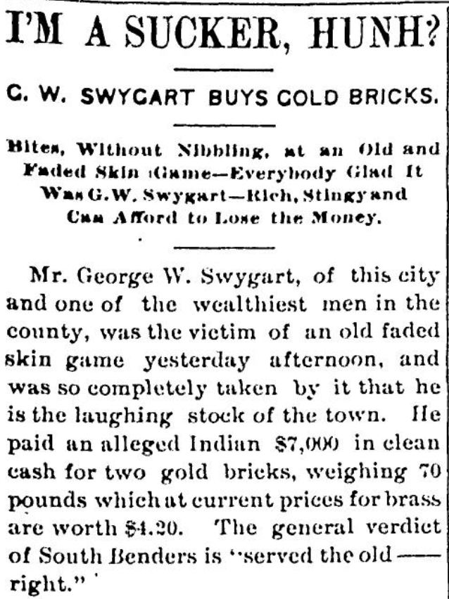 Before developers sought to turn the Homestead into a new residential area, the land was largely vacant countryside on the north side of the city border, then McKinley Ave. In addition to hosting “French Picnics”, the South Bend Tribune in May, 1892–at the top of the front page, no less–gleefully tells the tale of how “rich, stingy” G.W. Swygart was swindled by a group of conmen duping him into buying “gold bars” that they tested–and subsequently ripped him off for more than $7,000–in Coquillard Woods. (That’s about $235,000 in today’s dollars.)