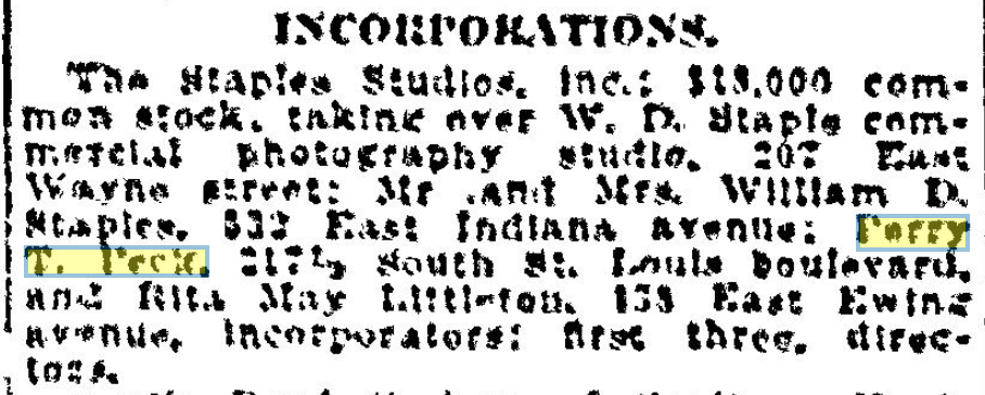 Reincorporation notice from the South Bend Tribune of ownership with Perry Peck in 1926.