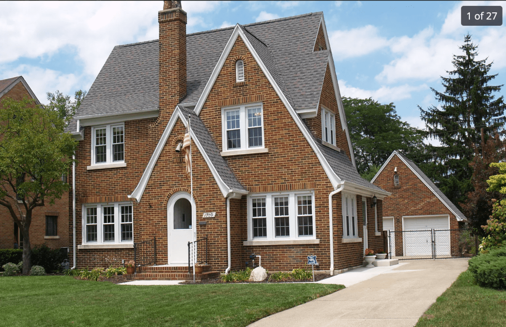 I figured that because Perry was filming, it couldn’t be terribly far from the house or he would have had to jog while shooting. So I went off on a walk to see what I was missing–and of course started out in the wrong direction. Because of the perspective, the brick house looks like there is a brick wall sticking out of the front (I was wrong). But there is a house a couple of blocks away that does have something that could look like it, so I started there. Nope. I was about to give up but decided to end my walk on E. Madison Street from Greenlawn west to N. Esther before turning home. Just before I turned onto Esther, I found it! Again, perspective and the lack of other houses threw me off. The house is about four doors from ours at 1709 E. Madison. Here it is today: