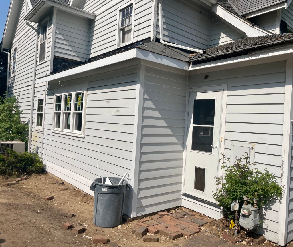 It is a beautiful day this last full week of May—80s, sunshine, and a light breeze. Our regular crew is finishing the exterior of the addition, including matching the paint to the rest of the exterior. They also painted the exterior wall with the back door out of courtesy and the ensuring cohesiveness of the rear view: very nice of them.