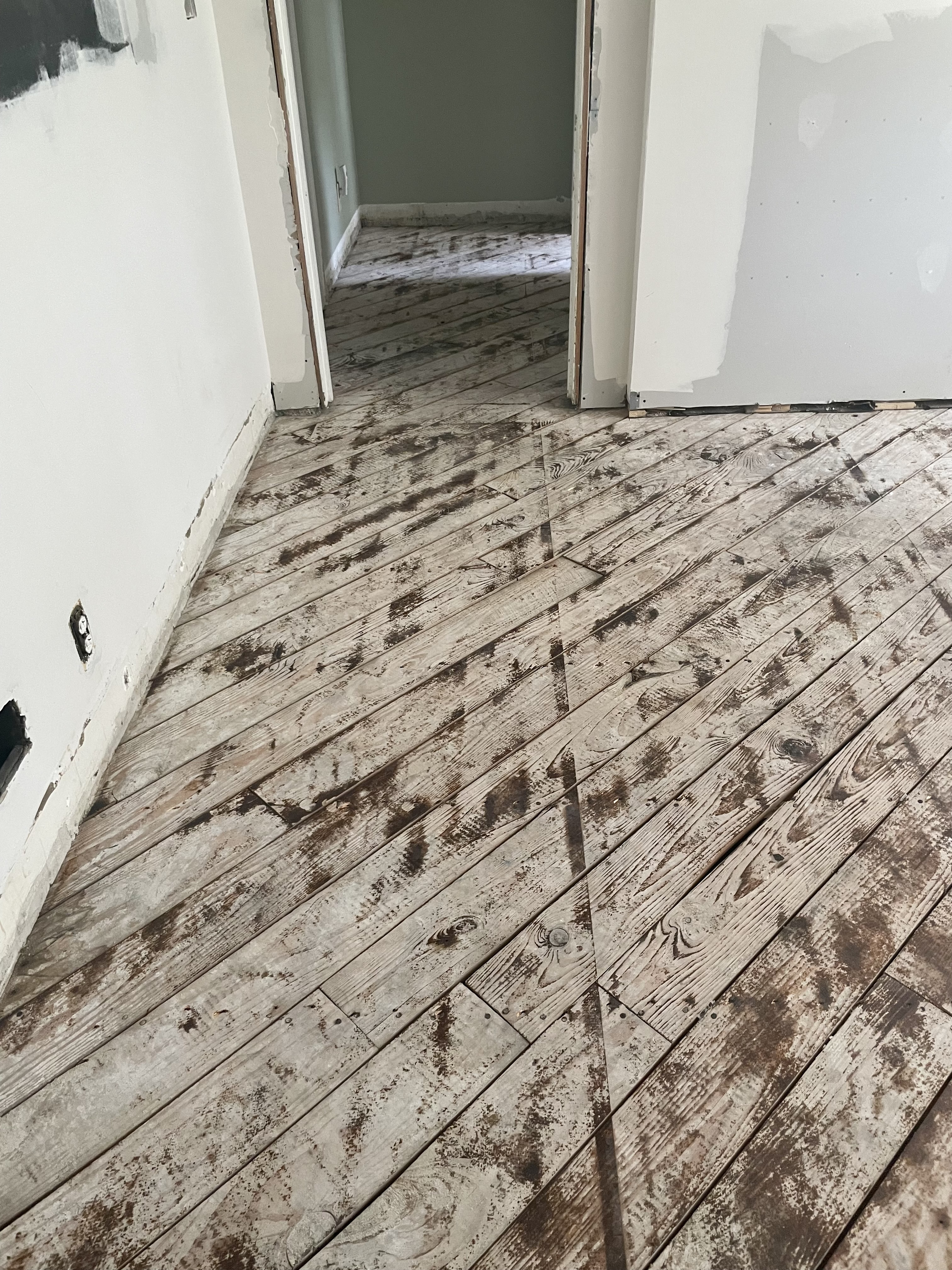 Today was comparatively quiet in part, I suspect, as our project manager juggled the time on task for multiple subcontractors. The wood floor subcontractor planned to be here in the morning to rip out the old pine flooring in the kitchen and hallway, which meant the drywall subcontractors had to call off their final day on the job. Unfortunately, the wood floor guys weren’t able to get here until after noon. When they arrived, they made quick work of removing the pine from the hall and the kitchen and cleaned up beautifully in only three hours. The new hardwood flooring is acclimating in the kitchen and is scheduled to be installed Monday. This will be great because the exposed subfloor is a little creepy with small gaps between them that means we can see into the basement. This is totally normal, but it will be great to not see it (and see nice flooring). Unfortunately, it looks like for most of next week, we won’t be able to use the back door because the hallway between the kitchen and mudroom (and thence to the back door) will also be replaced, as you can see in the photo above.