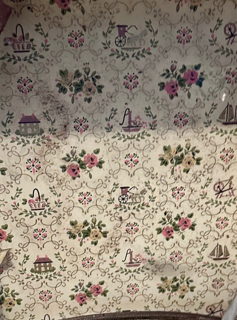 These floral wallpapers were popular–and inexpensive–in the early 20th Century, according to ThisOldHouse.com. They don’t necessarily define a style for the home. The exterior style is hard to define, but the interior strongly echoes a Craftsman vibe with major features of wood trim–but not with the lines one would expect with anything Craftsman style home. The juxtaposition of the romantic wallpaper and the Craftsman-esque woodwork suggests that Glenn and Agda were building their own style. The Studebaker Rockne doorknob faceplates support this idea.