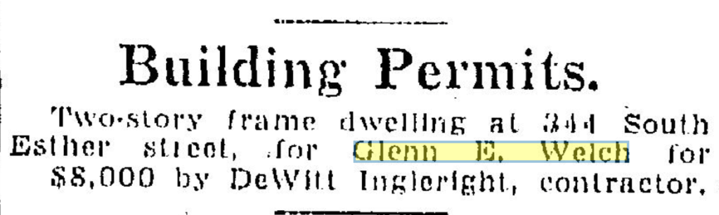 After a very frustrating week, which I will describe tomorrow when we expect to get answers, the weekend has been a relief being our little family with no workers around. It also gave me time to research some of the gaps in our understanding of the history of the house. For example, early in the 20th Century, the South Bend Tribune consistently listed building permits, but I couldn’t find any records for our house. In addition, our record of deeds implies that the original address for the property was on Madison Street. (We live on the corner of Esther and Madison Streets and it is clear that Glenn and Agda Welch bought two lots because they later built a house for their daughter and son in law on the second lot, facing Madison.) Then I remembered from my newspaper days how often reporters (and editors) misspelled names and addresses and that styles change in how papers referred to people. Because I was injured, I searched newspaper archives with various options. BINGO: