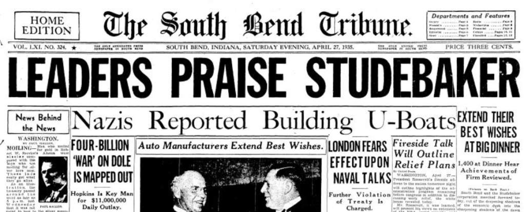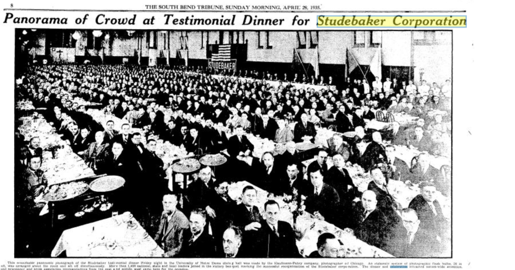 By the end of April, 1935, Studebaker emerged from receivership and South Bend had the largest celebration in its history, with an estimated 50,000 people celebrating in the streets and a major banquet with executives and political leaders—including Glenn Welch, whose picture is included in a display at the Studebaker Museum. (We know this because there is a similar likeness of him in an article from 1930 with photographs of executives.):