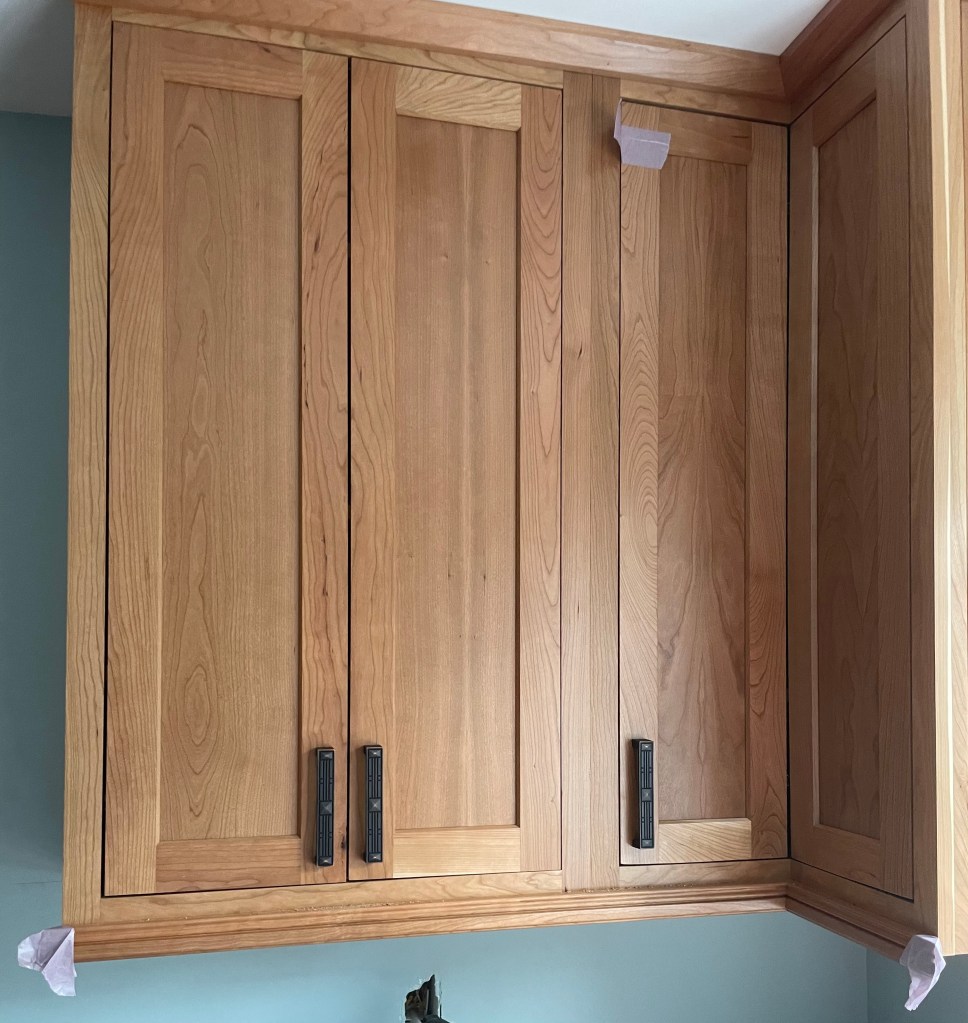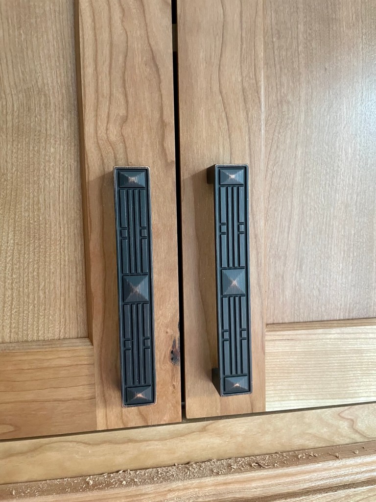 As we get ready for our 15th (ugh!) week of reno, we have some hints that we will have a functioning new kitchen and bathroom in two to four weeks. Here are some glimpses of our cabinet crown molding (that echoes that in the rest of the house) and our new handles: