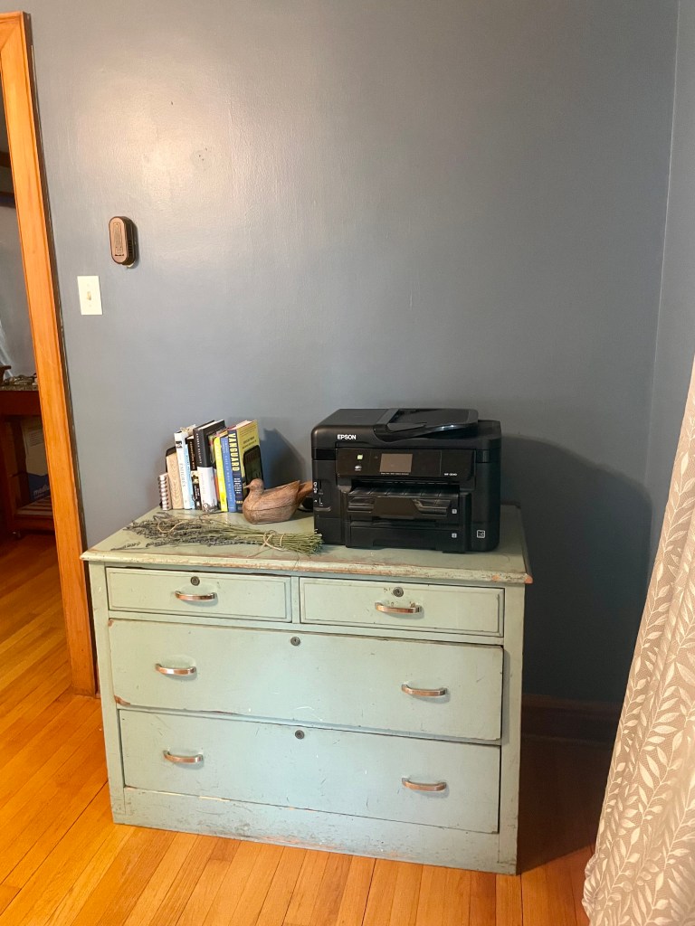So our “morning room” will also be a place to get dressed (there are two doors) and store everything we need for the 3/4 bath that has no storage. We have ordered some furniture from Etsy ( higher quality and less expensive than local retail) that has yet to arrive. We could not find a shelf that would look right without breaking the bank, so we repurposed an old dresser from my parent’s house to serve as towel storage and printer stand. Those of you affiliated with 801 will be amused at this. This chest of drawers is likely from the 1930s (any idea 801-ers?) because it was stashed in closets to store stuff well before I moved in in the early 1970s. It’s a wreck, but it’s a family wreck so I love it. (We will work on refinishing next summer.)