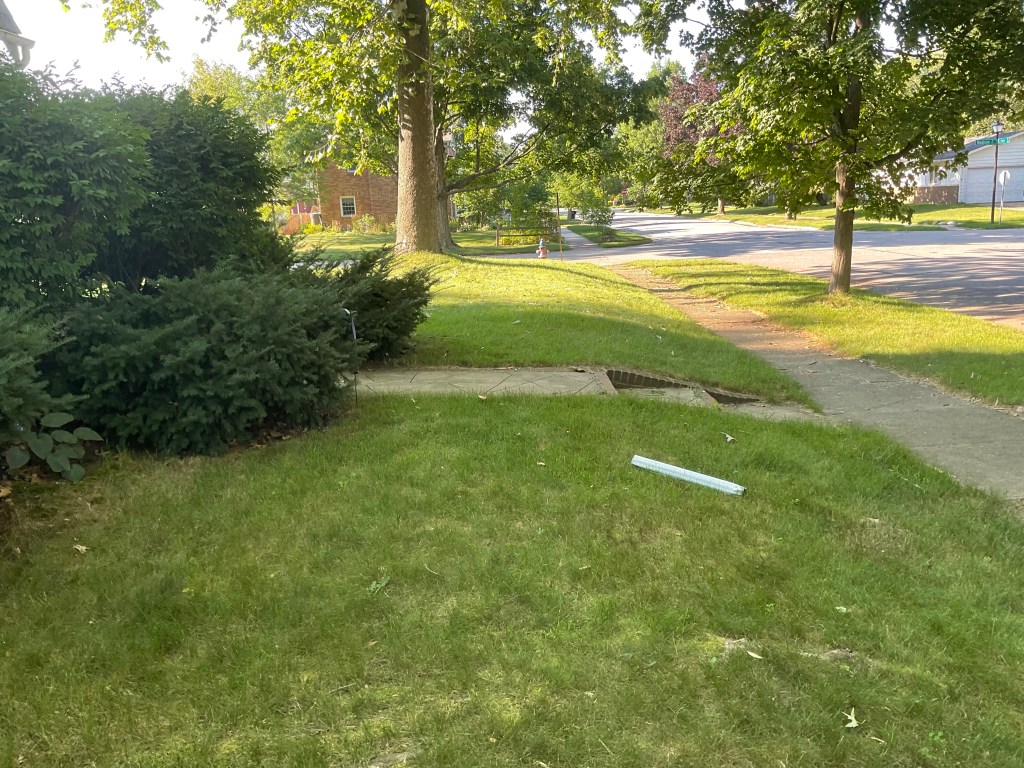 He did not pick up the old gutter segment his previous visitors left on the front lawn.