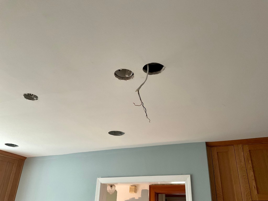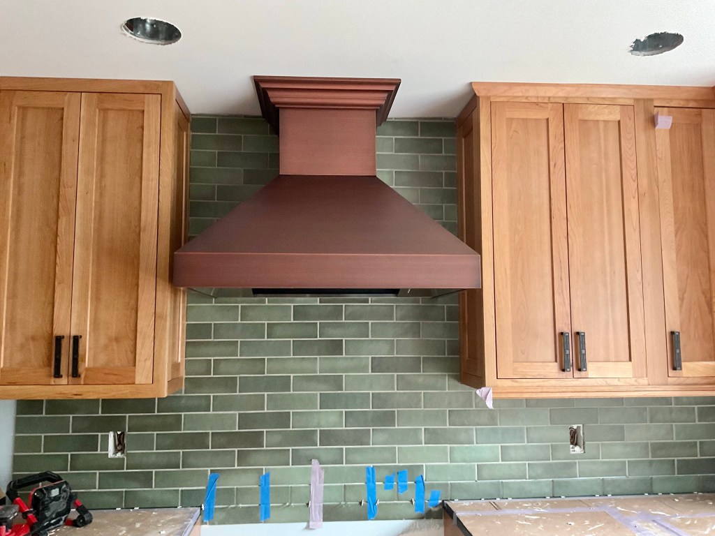 After six weeks of very little progress, we start week 16 with some real insights and future steps toward a functional kitchen—quite a bit because J1 returned on the task last week. Last week, he installed most of our (extensive) kitchen tile, highlighted a problem with the counter installation and worked with our Project manager to solve it, and today managed the counter fix, moved the island pendant light change, and installed the new range hood: