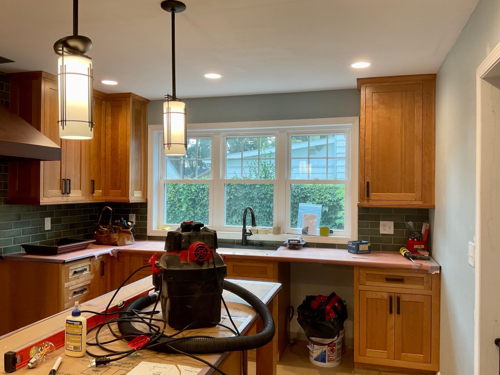 And yet. As we celebrated actual light in our kitchen for the first time in four months, our internet went out. Again. A week or so ago, it was because our neighbors trimmed their trees and also our aerial cable connection. AT&T came out quickly and repaired the break, and urged us to install a new cable that could be buried at their expense. We readily agreed. They left a long, thin, sinewy cable in our back yard and we took care to warn the crews working on the house to avoid and worked to not trip on ourselves.