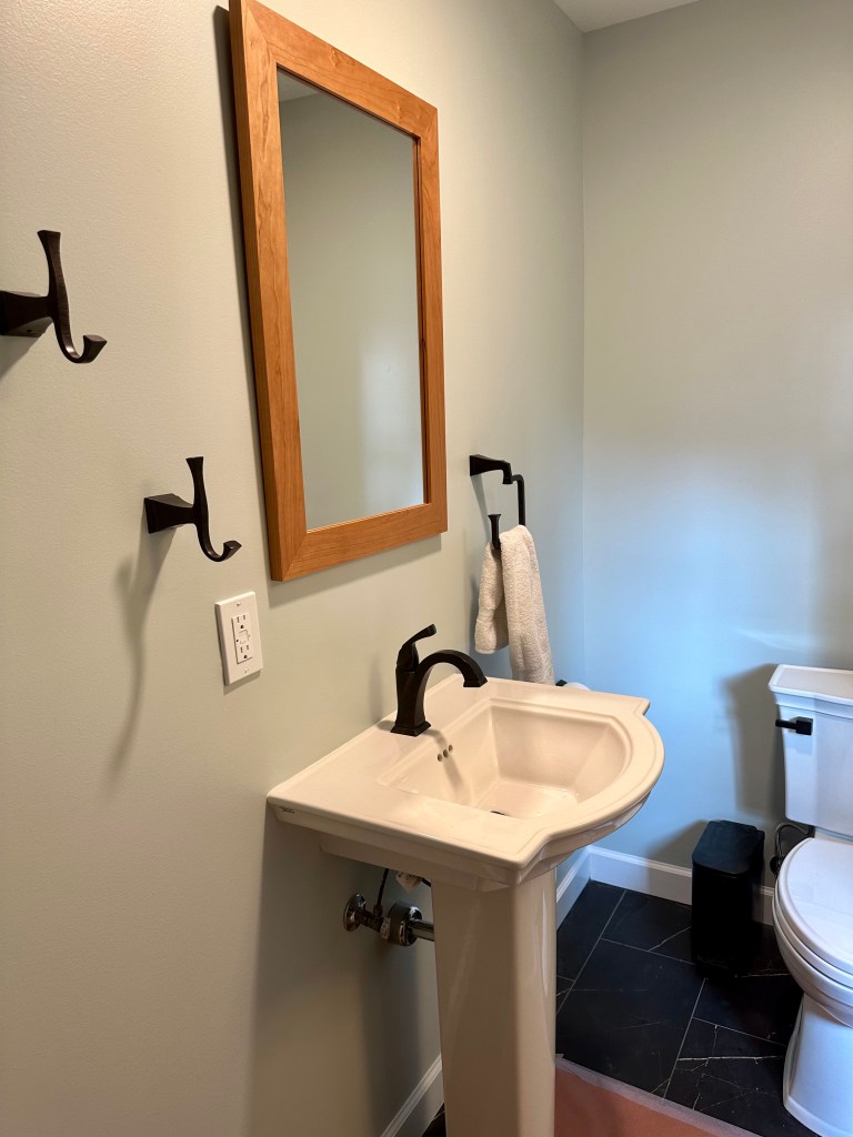 A view from the shower stall of the new appliances and fixtures. The pocket doorway is the light shining from the right of this photo. The mirror is a hand-made cherry frame from Etsy. The natural cherry echoes the doors throughout the house (which are darker from age) and the new cabinets in the kitchen. Searching Etsy has shown us that we can get exactly what we hoped for for LESS than what we could buy at a big-box store.