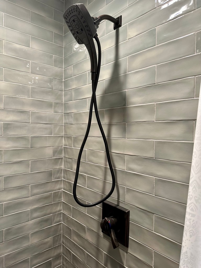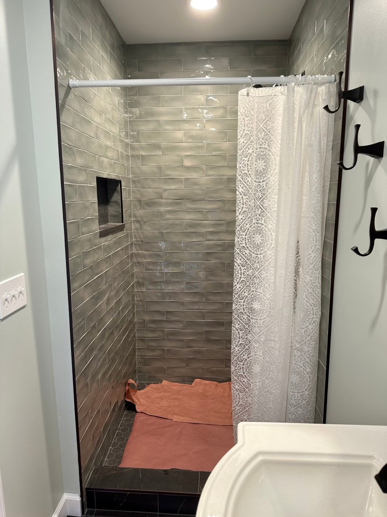 We had really hoped that our new, 3/4 bath would be at least fully usable before classes began this past Monday, but we learned today workers won’t finish even the temporary work until tomorrow–meaning finishing cleaning the grout haze, paint mistakes, and installing all of the hardware. Today, we had hardware installed as well as a temporary shower curtain until the custom-made glass door is finished and installed. Here’s a look: