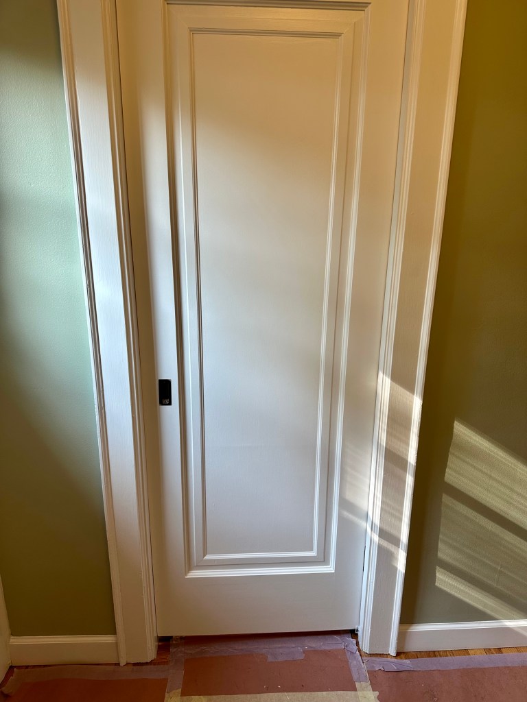 This is the door to the new bath from the mudroom. It is the original cherry door that opened from the hallway that connects the mudroom to the kitchen (to the right of this photo), but has been painted white to coordinate with the mudroom. It is also now a pocket door to allow more space in the bathroom.