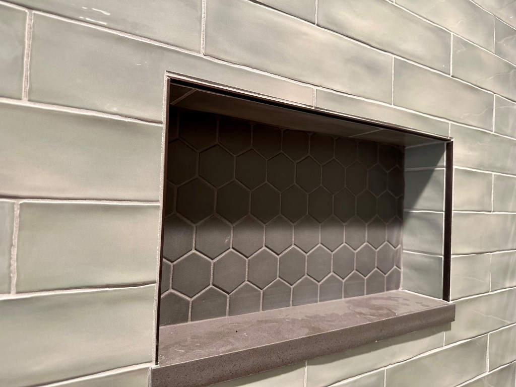 The new (dusty) shower niche. The hexoganal tle is the same that is on the shower floor.
