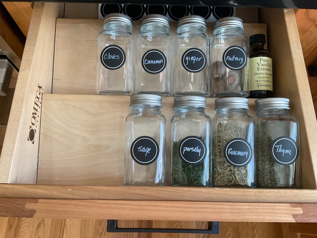 We haven’t actually moved into the new kitchen completely because we lose access to the room periodically to replace the counters (three times now) and fix the ceiling repeatedly, so we often have to search the basement “pantry” for infrequently used items, like sage for the sage stuffing. You guessed it, we didn’t have it! (South Bend Kroger, strangely, for the win with fresh sage!)