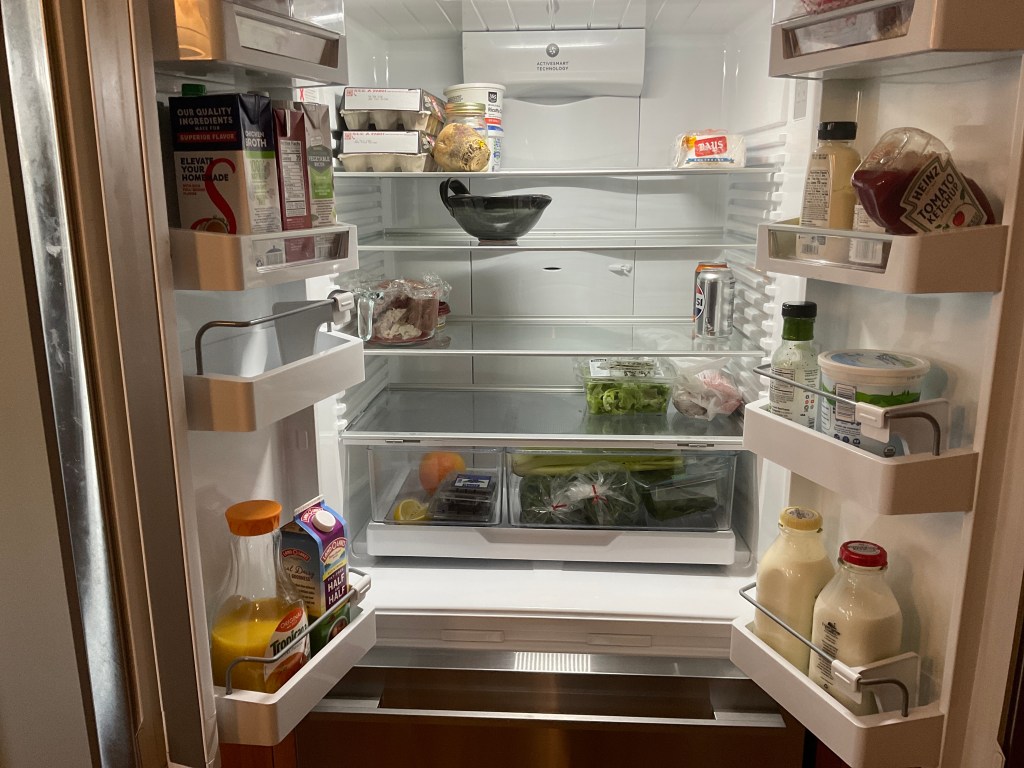 And by the early afternoon, I realize that the (brand new) refrigerator is a disgusting conglomeration of everything Dan wants to keep handy. Time for spring cleaning (because, gross) and to fit in what we actually need for the day. We have a second refrigerator in the basement that can store things we don’t use every day so the main fridge can stay clean and organized with fresh food.