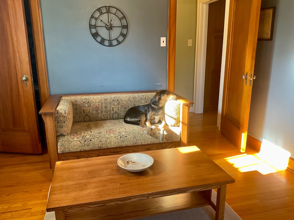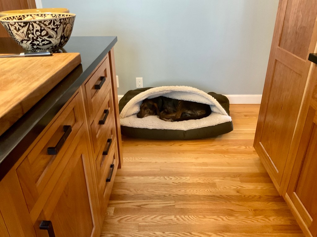 Our dining room is still the Keeper of Stuff We Need To Put Away Or Donate, so we’re eating in the kitchen today. Perhaps by Christmas (fingers crossed) our lives will be back to normal. One note about having serious professionals do your reno—despite the cost. They are experts in ways you did not anticipate. To wit: the door on the center left, below, is the original swinging door that goes into the dining room. For the entire almost nine years we have lived here, and presumably many years before, this nearly 80-year-old door regularly scraped against the frame. When the team replaced it near the end of the reno, they repaired the “fit” and mechanisms so it now works like it did in 1937, when Glenn and Agda had their first Thanksgiving in their new home.